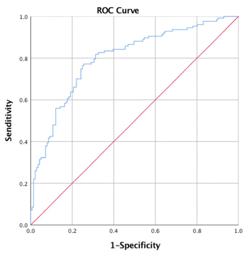 Hosmer–Lemeshow test for multivariate models showed a good fit (χ2 = 7.263, p = .509). As shown in Figure 2, the AUROC was 0.799.