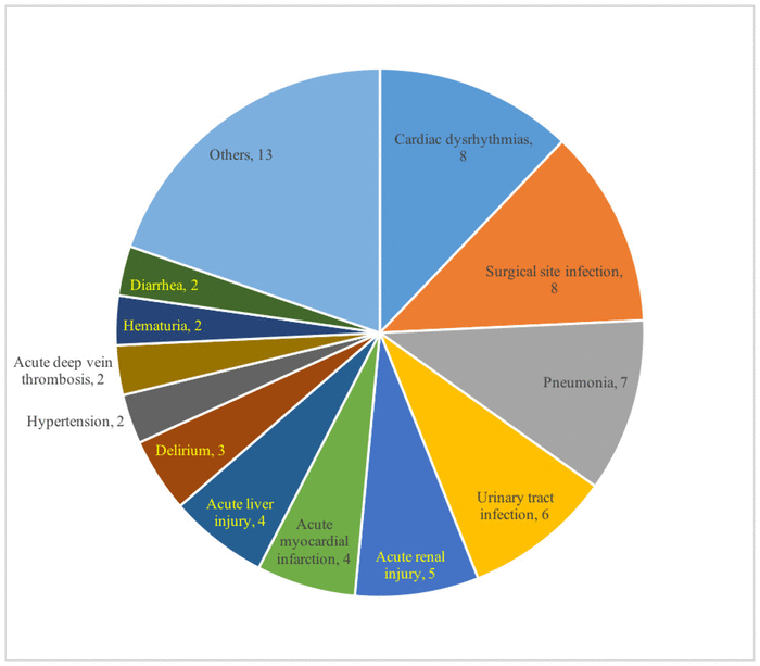 The most common comorbidities were hypertension (63.1%), DM (36.6%), IHD (28.0%), CVD (22.4%), psychiatric conditions (17.2%), PVD (16.0%), and hyperlipidemia (14.2%) (Table 1). A total of 46 patients with 66 types of postoperative complications was reported. The most common complications were cardiac dysrhythmias (3.0%), surgical site infection (3.0%), pneumonia (2.6%), urinary tract infection (2.2%), and acute renal injury (1.9%) (Appendix B).