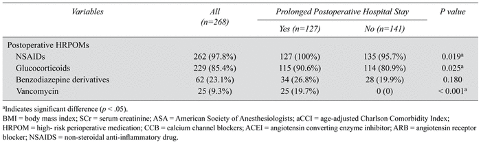 We also found that increased numbers of postoperative medications and HRPOMs were independent risk factors for prolonged LOS. It was easy to understand that longer hospital stay is associated with increased postoperative complications, and therefore more medications were needed. The top four postoperative HRPOMs were NSAID, glucocorticoids, benzodiazepines, and vancomycin. Surgeons often used NSAID which could relieve postoperative pain, and glucocorticoids which could reduce tissue edema. Insomnia in elderly patients may worsen after surgery, and the usual treatment is to continue taking benzodiazepines. Interestingly, in this study, 25 patients who used vancomycin after surgery were all in the prolonged postoperative LOS group. After analyzing the postoperative complications of these patients: seven patients had confirmed or suspected surgical incision infection; eight had confirmed or suspected pulmonary infection; and vancomycin was used to prevent wound infection in four patients following postoperation evalution, because of the high risk of infection. No specific reasons for using vancomycin were reported in the other six patients (Appendix D). In multivariate analysis, no independent risk of these four types of medications was observed for prolonged LOS. However, the number of postoperative HRPOM was an independent risk factor for prolonged LOS. These findings are in line with previous studies suggesting the risk of PIMs on various conditions in older adults.(37,38) Hence, managing polypharmacy, including postoperative medications, could shorten the LOS, irrespective of HRPOMs classes.