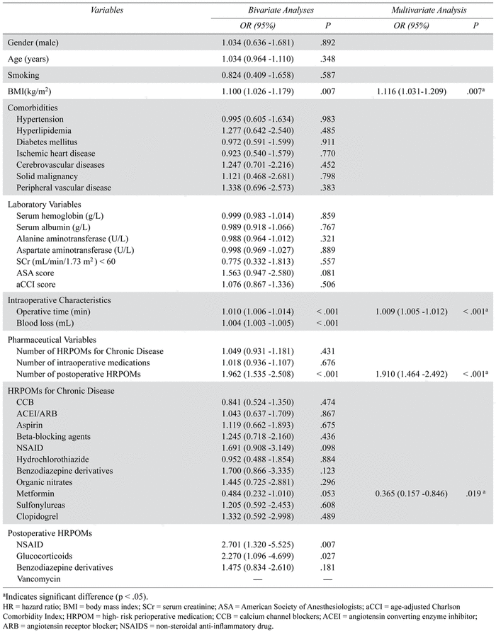 A data collection sheet was used to collect the demographic characteristics (age, gender, body mass index [BMI]) and comorbidities of the relevant patients. The following clinical data was collected: 1) comorbidities: hypertension, hyperlipidemia, diabetes mellitus (DM), ischemic heart disease (IHD), cerebrovascular disease (CVD), solid malignancy, and peripheral vascular disease (PVD); 2) preoperative laboratory values: hemoglobin, serum albumin (ALB), alanine aminotransferase (ALT), aspartate aminotransferase (AST), and serum creatinine (SCr); 3) intraoperative values: operative time and blood loss; 4) the American Society of Anesthesiologists (ASA) score and the age-adjusted Charlson Comorbidity Index (aCCI) score; 5) postoperative LOS; 6) information on postoperative complications; 7) list of current medications for chronic diseases and those prescribed after the admission (intra- and postoperative medications). Screening for HRPOMs was performed with Microsoft Excel Visual Basic for Applications and was manually reviewed by two clinical pharmacists (Shen and Chu).