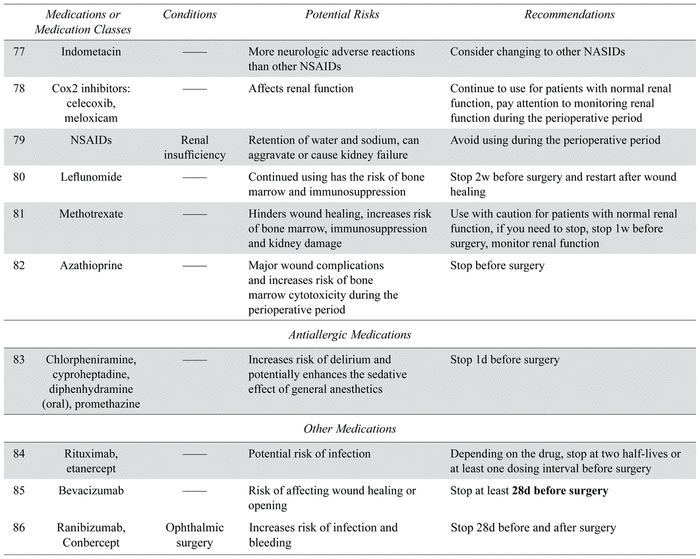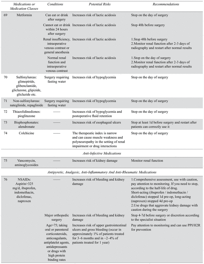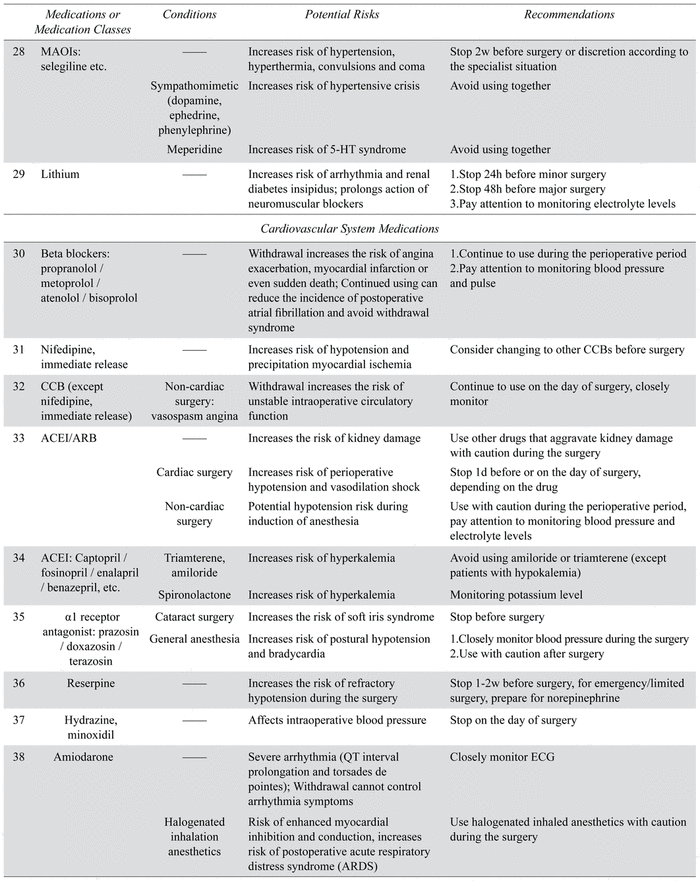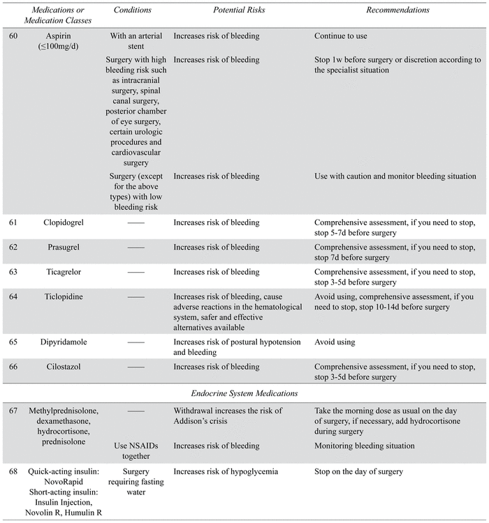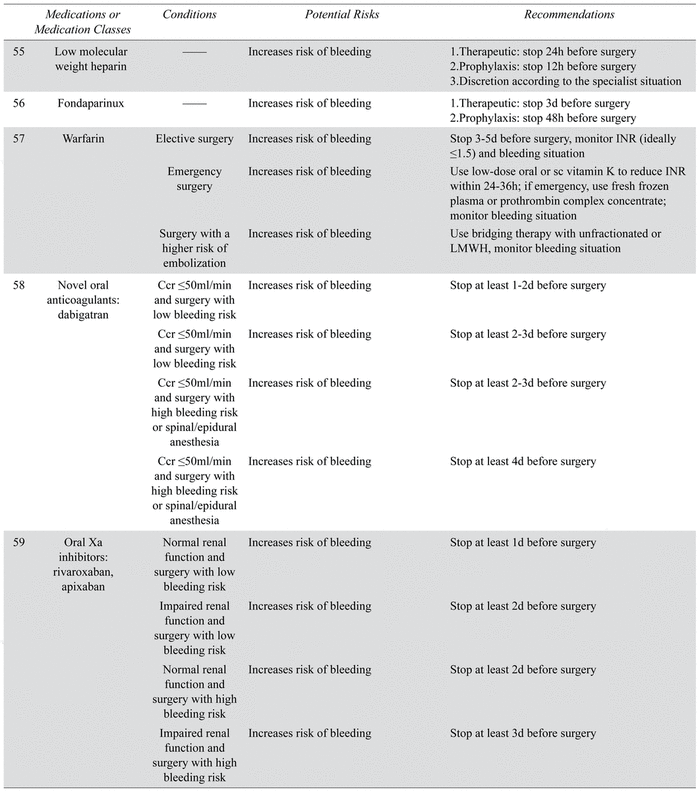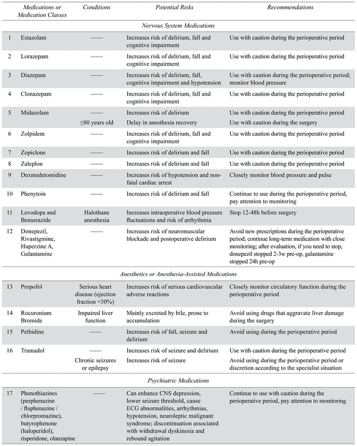 In 2019, experts in the China Gerontology Pharmaceutical Alliance have developed an explicit criterion as a tool for reviewing the high-risk perioperative medications (HRPOMs) for older patients(11) (Appendix A). It was the first recommendation to provide guidance on older patient-specific HRPOMs. The recommendation provided a list of HRPOMs that may affect the postoperative outcomes in older patients, and reached a consensus on potential strategies to avoid the associated risks. This recommendation largely fills the gap in geriatric surgery, particularly from the perioperative drug management perspective. It has a narrower list of HRPOMs than that of the American Geriatrics Society (AGS) Beers Criteria,(5) which is an explicit list of potentially inappropriate medications (PIMs) for older adults, and provides drug-specific recommendations.