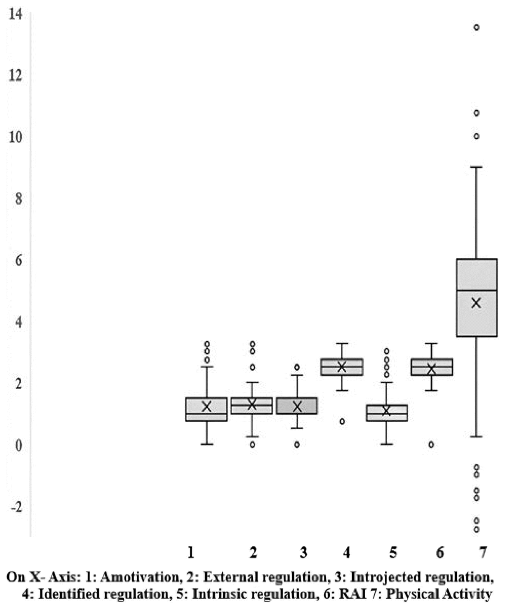 In Figure 1, the potentially low, as well as high, outliers were revealed. Identified Regulation and RAI showed potentially lower outliers. Amotivation and Intrinsic regulation revealed potentially high outliers, while distribution of External regulation, Introjected regulation, and PA showed both type of outliers (i.e., potentially low and high outliers). This figure is highlighting extreme values (outliers) that deviate significantly from the mean, since median is less affected by outliers, median was used for further analysis as described in Table 2.