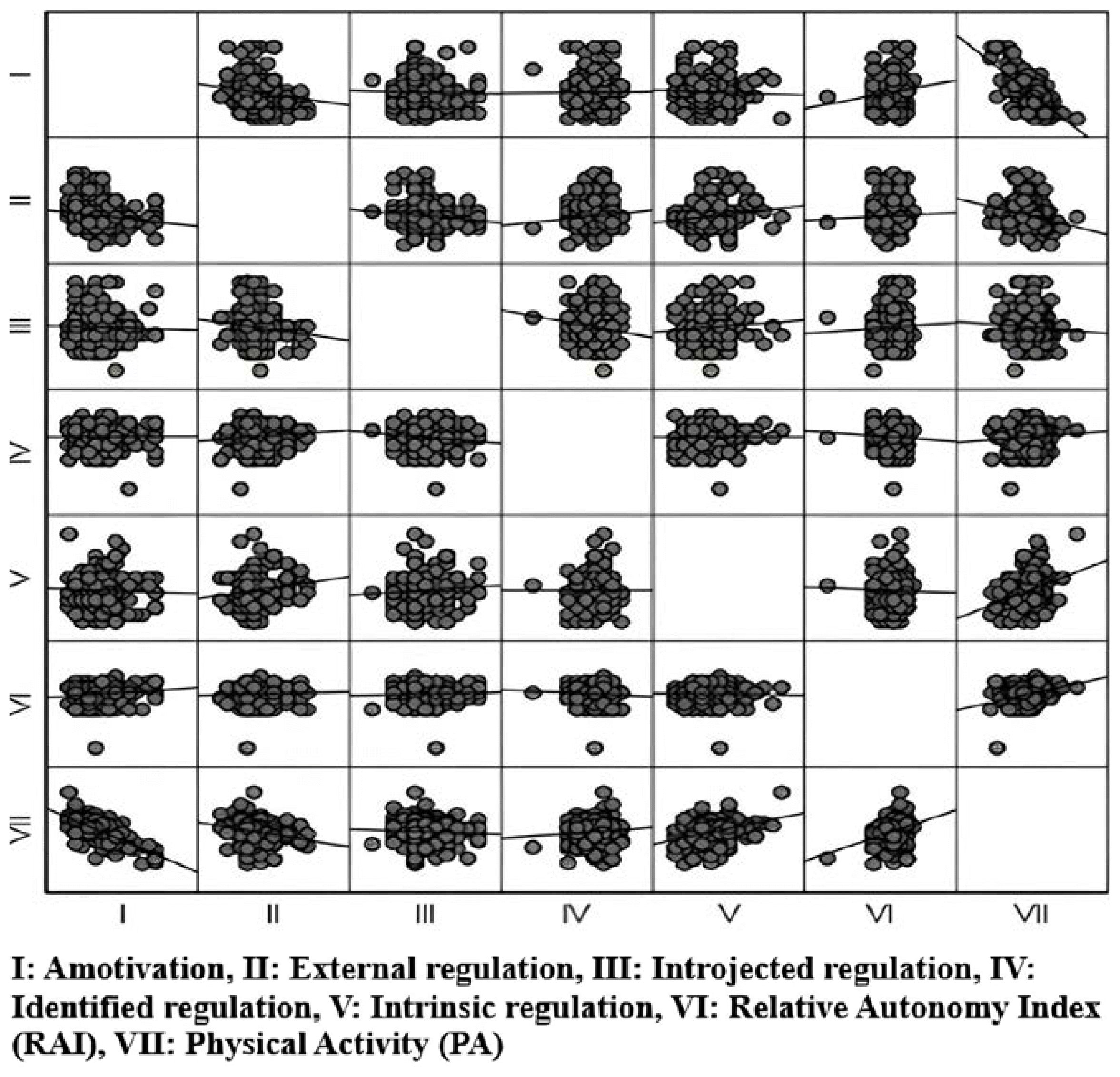 Figure 2 depicts the correlation scatter matrix in terms of relationships between various motivational factors and physical activity (PA) among studied elderly population. In this analysis, every single variable was assessed with remaining each seven pre-defined variables individually for positive and/or negative correlation. So, in toto, eight variables as per BREQ–3 were correlated with each other. Amotivation, a lack of motivation, shows a strong negative correlation with external regulation (−0.148*) and a particularly strong negative correlation with PA (−0.689**), suggesting that individuals who lack motivation are less likely to engage in physical activity. On the other hand, intrinsic regulation shows a strong positive correlation with PA (0.342**), implying that individuals who are intrinsically motivated are more likely to be physically active. External regulation shows positive correlations with identified regulation (0.103) and intrinsic regulation (0.153*), indicating that individuals who are externally regulated may also exhibit higher levels of identified and intrinsic motivation. Furthermore, RAI is positively correlated with amotivation (0.133*) and PA (0.328**), suggesting that it plays a role in both motivational factors and physical activity. These findings provide valuable information for researchers and practitioners aiming to understand and potentially enhance motivation for physical activity (Figure 2; asterisks explained in footnotes).