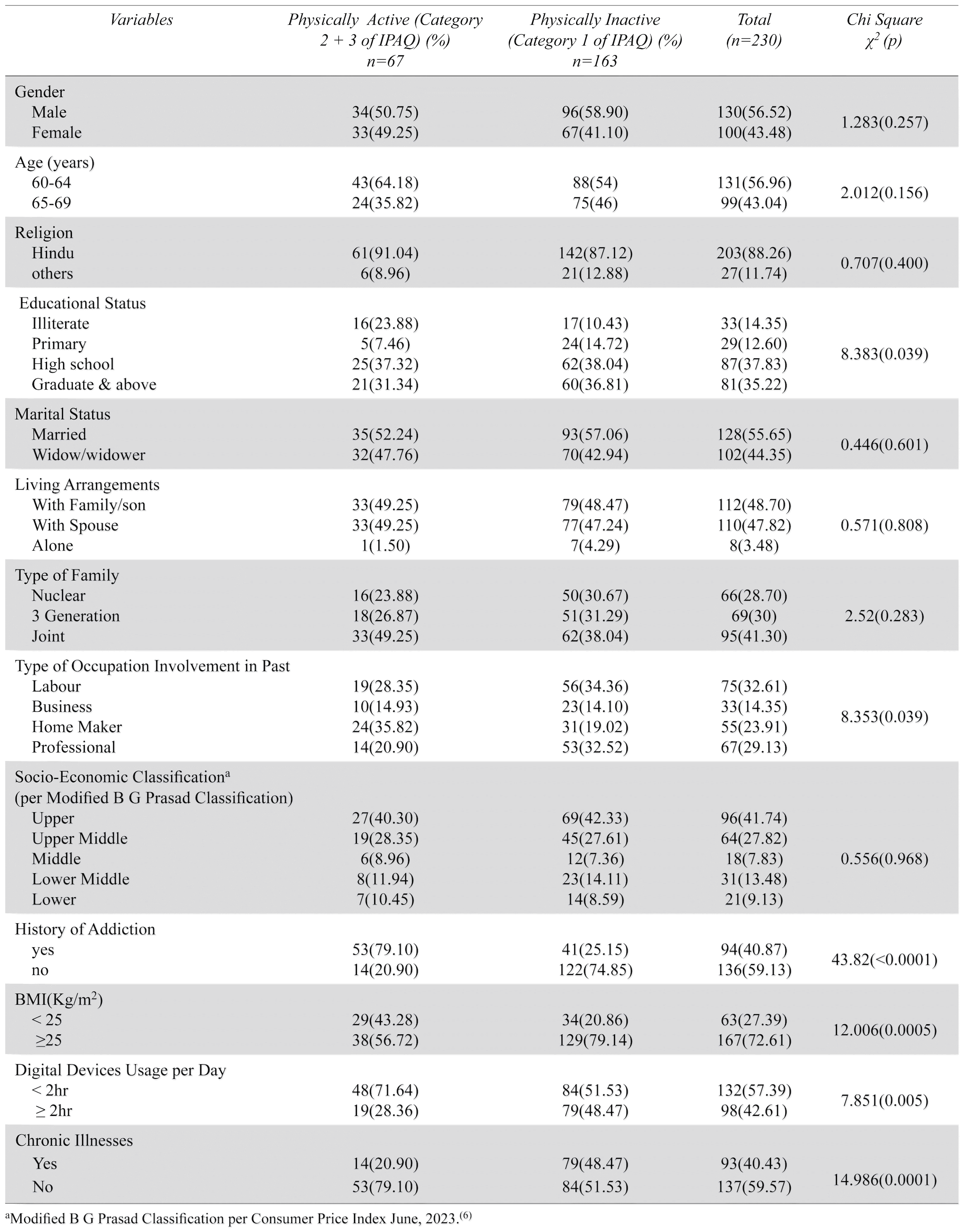 Of total 230 study participants, 67 (29.13%) were physically active (cumulative for Category 2 and Category 3), while the remaining 163 (70.87%) were found physically inactive (i.e., minimally active [Category 1]). The HEPA category, Category 3, included only one subject, so, for further statistical analysis, it was merged with Category 2. Therefore, physical active and the comparative analysis was done for physically inactive (Category 1) versus physically active (Category 2 and Category 3 combined). Of total 230 patients studied, 131 (56.95%) were from age-group 60–64 years, while the remaining belonged to 65–69 years age-group. Of total, 130 (56.52%) were males and 203 (88.26%) were following Hindu religious ideology, slightly more than one-third (81, 35.22%) had education level of graduate and above, slightly less than one-third (75, 32.61%) were labourers by occupation in past, nearly three-forth (167, 72.61%) had BMI ≥ 25 kg/m2. Of total, 98, 42.61% were using digital device for more than two hours per day, while 93, 40.43% had one or more chronic co-morbidities (Table 1).