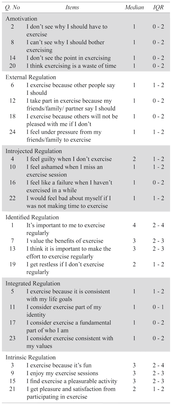 Motivation scores in various subdomains of BREQ among the study participants are described in Table 2. The overall median score was found to be higher for item 1(“It’s important to me to exercise regularly”) in the domain of identified regulation (i.e., 4 with interquartile range (IQR) 2–4), which means that most of respondents agreed with or showed positive attitude towards it. Interquartile range (IQR) 1–4, which means the person is doing the PA willingly by understanding the benefits. Participants reported higher scores on the self-determined motives and lower on the others. Remaining sub-domains like amotivation, external regulation, and integrated regulation revealed median value of 1 with almost similar interquartile range (i.e., either 0–2 or 1–2). The sub-domains of identified regulation and intrinsic regulation revealed median value of 4 or 3 in majority items, except for items no. 19 and 21 which recited “I get restless if I don’t exercise regularly” and “ I get pleasure and satisfaction from participating in exercise”, respectively, with median value of 2 (Table 2).
