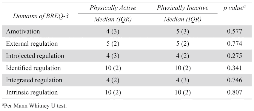 Data entry and data analysis were pursued with standard software, Microsoft office Excel version 2019 and Statistical packages for social sciences (SPSS Version 26). The data were analysed with chi-square test and p value of < .05 was taken as significant. Motivation scores in various subdomains of BREQ were analysed with median, inter-quartile range (IQR), while association of physical activity involvement (as per IPAQ) with various domains of BREQ-3 was assessed with applying Mann Whitney U test.