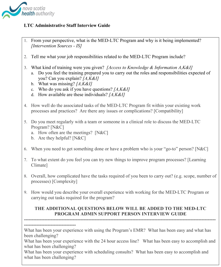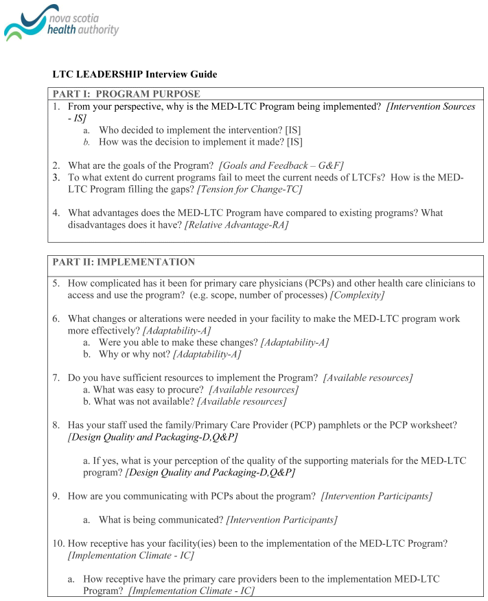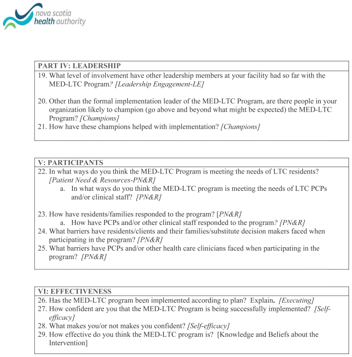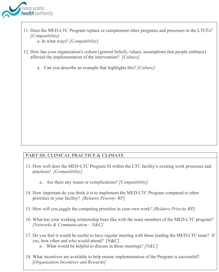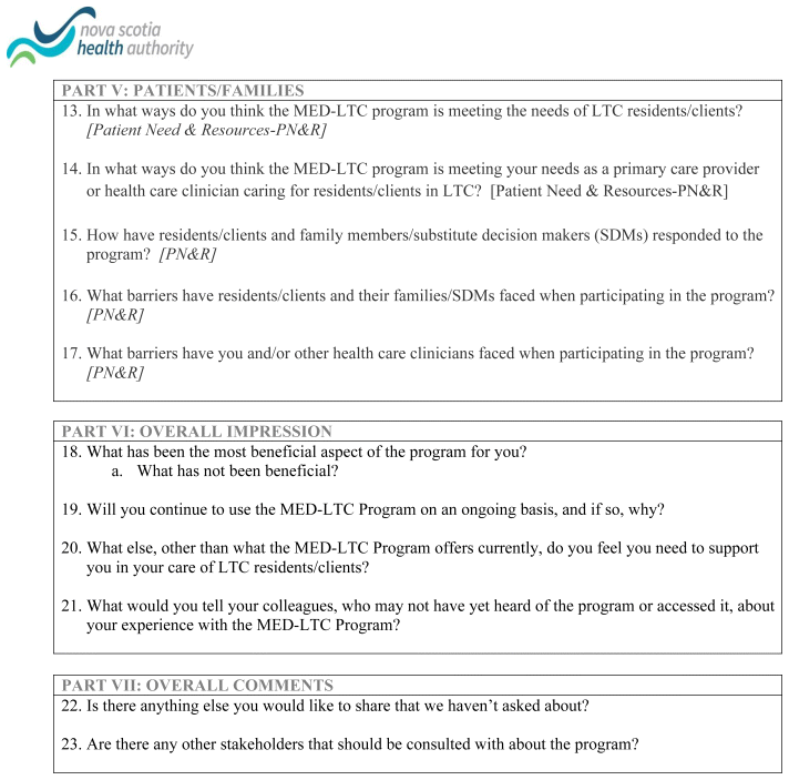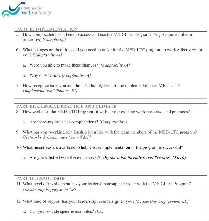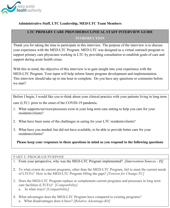 This retrospective, qualitative study employed structured interviews with the implementation team, LTC staff, and LTC leadership to gather data about the MED-LTC program after it had ended. The primary objective was to identify factors supporting implementation to inform ongoing collaboration for frailty-informed care delivery. The study was approved by the Nova Scotia Health Authority Research Ethics Board, Ref No. 26635.
