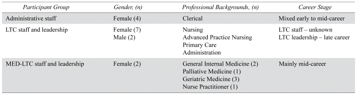 Twenty participants were recruited (17 interviews, 3 email responses) including: seven MED-LTC clinicians, four administrative members, and nine LTC staff, including leadership, from four LTC facilities. Participant characteristics are outlined in Table 1.