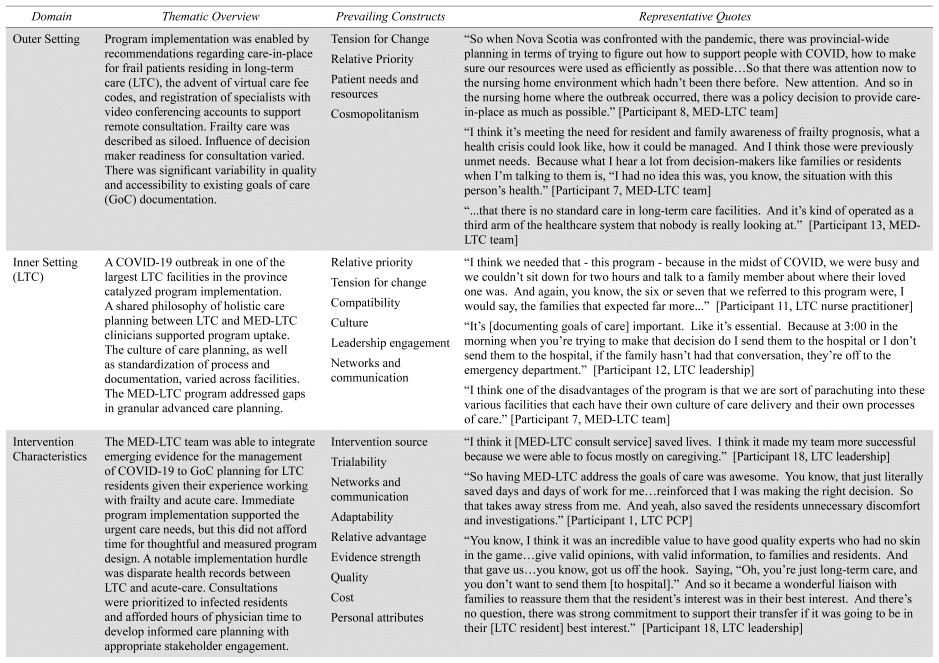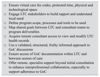 The MED-LTC implementation study provides important insights to support the future spread and scale of embedding virtual specialist consultation services into LTC. This study is proof of concept that GoC programming can be delivered virtually by specialist physicians in community settings. The analysis underscores the importance of collegial relationships and shared care philosophies to effectively implement frailty-informed care initiatives during health-care emergencies. However, sustaining cross-sectoral GoC services may be challenging amidst evolving workloads and prevailing cultural perceptions of end-of-life care needs. This implementation science study of the MED-LTC program describes the enabling and impeding factors that support the use of a structured, virtual GoC discussion to reduce unnecessary transfers to hospital and promote frailty aligned care plans.