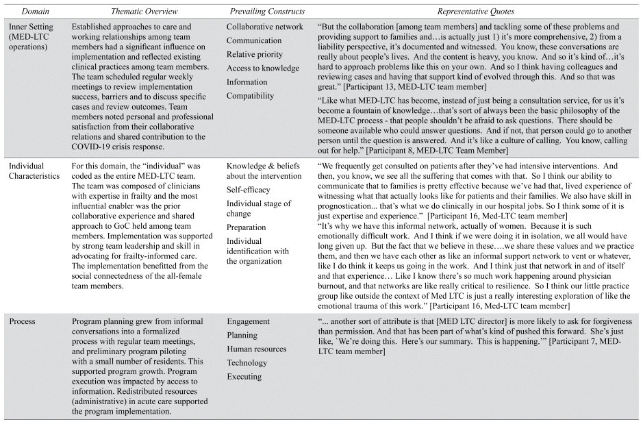For this domain, the “individual” was coded as the entire MED-LTC team. The most influential enabler was the team’s prior collaborative experience and shared approach to GoC (knowledge & beliefs about the intervention, self-efficacy). MED-LTC members self-identified as frailty experts who worked in acute care and routinely navigated complex decision-making (individual stage of change, preparation, individual identification with the organization). Adapting this work to LTC virtual consultations was a professionally rewarding contribution to the pandemic response.