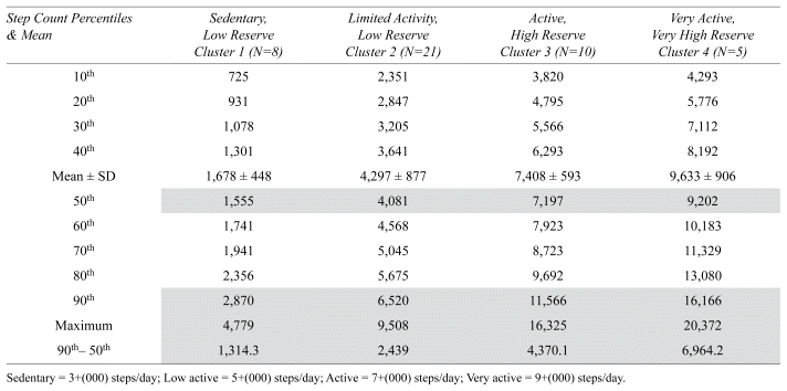 Four clusters best represented the distribution of reserve in this sample, hypothesized to be defined as the difference between the median and 90th percentile of the step-count distribution. Cluster 1, with the lowest reserve would also be classified as sedentary based on median step count (1,555 step count; 1,314 reserve). Cluster 2 represented people with limited activity with low reserve (4,081 step count; 2,439 reserve). Cluster 3 represented active people with high reserve (7,197 step count; 4,370 reserve). Cluster 4, was very active with very high reserve (9,202 step count, 6,964 reserve).The factors associated with cluster membership were gait speed, sit-to-stand, and depression.