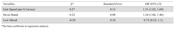 The characteristics of participants in each cluster are presented in Table 3. These factors were used in the regression model to identify the extent to which they were associated to cluster membership. Table 4 shows that only gait speed, sit-to-stand, and low mood were associated with cluster membership. Goodness-of-fit tests for the ordinal regression showed good fit for the largest cluster.