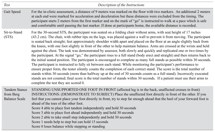 PROs potentially affecting reserve were general health perception, pain, and low mood measured on a visual analogue health scale (VAHS)(25) from 0 to 10, with higher values indicating better general health but greater pain and low mood. Also measured were PerfOs of comfortable gait speed (meters per sec), sit-to-stand (STS: count in 30 sec), and tandem stance, item from the Berg Balance Scale (5 level ordinal scale). Participants were permitted to use a gait aid for the performance tests. Daily step count over the entire study period was provided by a pedometer (TechO). Details on the administration of these tests are included in the Appendix (Table A1).