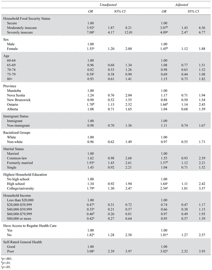 Following the literature on food insecurity and to account for possible confounding factors, we included three sets of control variables. These are demographic, socioeconomic, and health-related variables. Demographic and socioeconomic factors include age of respondents (0 = 80 years or older; 1 = 75–79 years; 2 = 70–74 years; 3 = 65–69 years; 60–64 years); racial background (0 = White; 1 = Non-White); immigration status (0 = native-born; 1 = immigrant); sex (0 = male; 1 = female); province of residence (0 = Manitoba; 1 = Nova Scotia; 2 = New Brunswick; 3 = Ontario; 4 = Alberta); marital status (0 = married; 1 = common-law; 2 = formerly married; 3 = single); level of education (0 = no high school education; 1 = high school education; 2 = college or university education); and household income (0 = less than $20,000; 1 = $20,000 to $39,999; 2 = $40,000 to $59,999; 3 =$60,000 to $79,999; 4 =$80,000 or more). Finally, we included self-rated general health (0 = good; 1 = poor) and access to regular health care (0 = Yes; 1 = No) as two health factors.