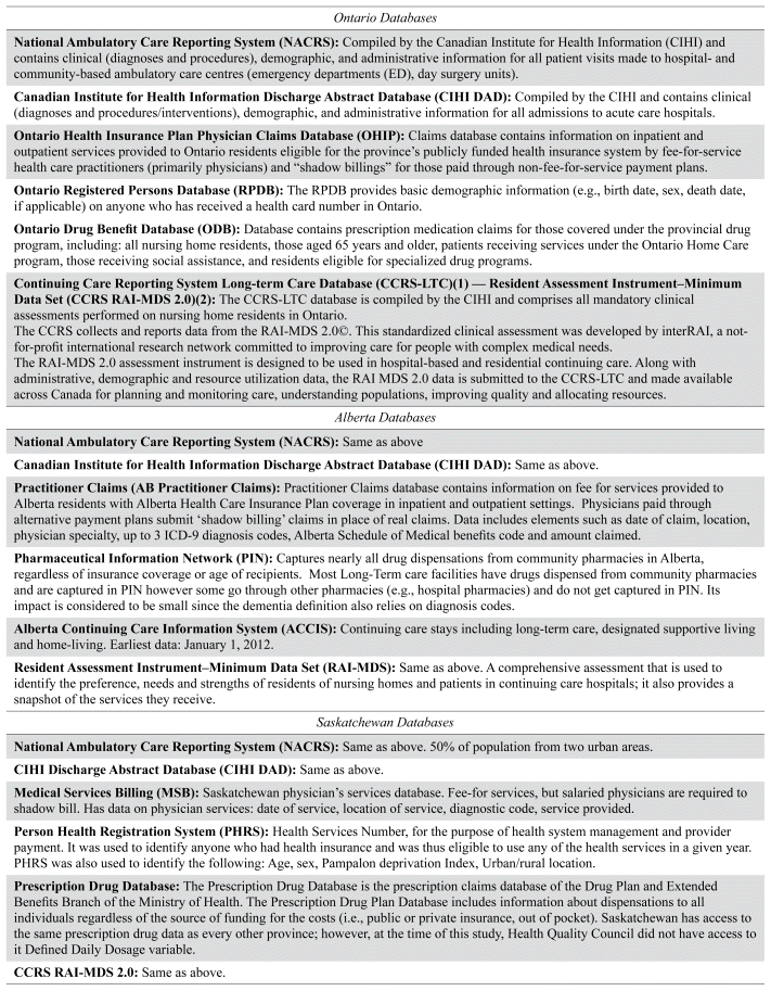 This project was funded by a grant (VR5-172692) by the Canadian Institutes of Health Research (CIHR), Canada. This work was also supported by: the Canadian Consortium on Neurodegeneration in Aging, which is supported by a grant from the Canadian Institutes of Health Research with funding from several partners; the Alberta Strategy for Patient Oriented Research Support Unit (AbSPORU) which is funded by the CIHR, Alberta Innovates, and the University Hospital Foundation, the University of Alberta, the University of Calgary, and Alberta Health Services; and ICES, which is funded by an annual grant from the Ontario Ministry of Health (MOH) and the Ministry of Long-Term Care (MLTC).