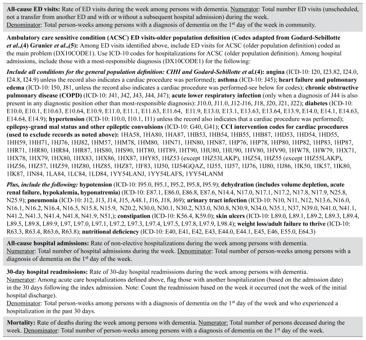 We measured all-cause emergency department (ED) visits, ambulatory care sensitive conditions (ACSC) ED visits,(25,26) all-cause hospital admissions, 30-day hospital readmissions, and all-cause mortality (see Appendix 1B for definitions). Outcomes were measured from the index date until the cohort exit, as described above.