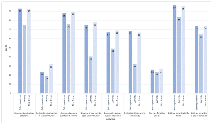All activities were decreased at the time of the survey due to Covid-19 restrictions that imposed new challenges to their continuation. While Covid-19 was a limitation, the implications remain relevant as infection prevention is a priority in CCH, with protocols and responses that similarly affect community integration.(30) The decline in these activities had major detriments to residents, highlighting the importance of maintaining community connections for older adults in CCH. While restrictions limited the types and amounts of activities that CCH could offer, they also prompted CCH to undertake different approaches to community integration. As CCH prepare to bring activities back, it may be beneficial to incorporate some of these innovative ways to open CCH up to their communities. Existing technology (e.g., Zoom) used to support virtual programming during Covid-19 may be maintained or expanded upon to give residents a way to remain connected to their communities in the event of illness.