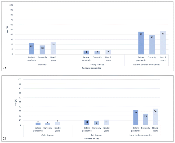The range of community-integrated activities varied widely (Figure 1), including arrangements where the CCH offered residency to populations other than older adults (Figure 2A) and/or offered services on site (Figure 2B). Before Covid-19 restrictions, the most common activities were spiritual activities entering CCH (96.5%) and community volunteers entering CCH (93.0%, Figure 1). CCH rarely had activities such as offering residence to young families (7.8%) or child daycare (5.2%, Figures 2A and 2B). At the time of the survey (2022), spiritual activities entering CCH continued to be the most common (83.6%). However, this had not been restarted by 12.9% of respondents; CCH were planning to restart the ceased activity in the future (n=16) or start it up as a new activity (n=1). All community-integrated activities were reduced at the time of the survey, compared to before Covid-19 (Figures 1 & 2). This decrease was more drastic for some activities than others; for example, dining facilities open to the community fell by 36.5%, whereas daycare for older adults fell by 2.6%. For activities planned over the next two years, many CCH wanted to re-implement ceased activities. Some CCH intended to begin new activities that were not present before Covid-19; the percentage of “Yes” responses to residents volunteering in the community was 31.9%, compared to 23.5% before Covid-19. There was no statistically significant (p < .05) relationship between any activity and facility type, size, owner-operator model, or geography at any survey time category (Table 2).