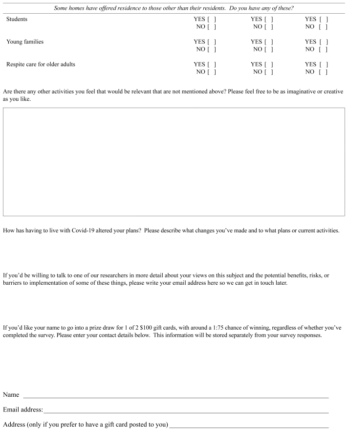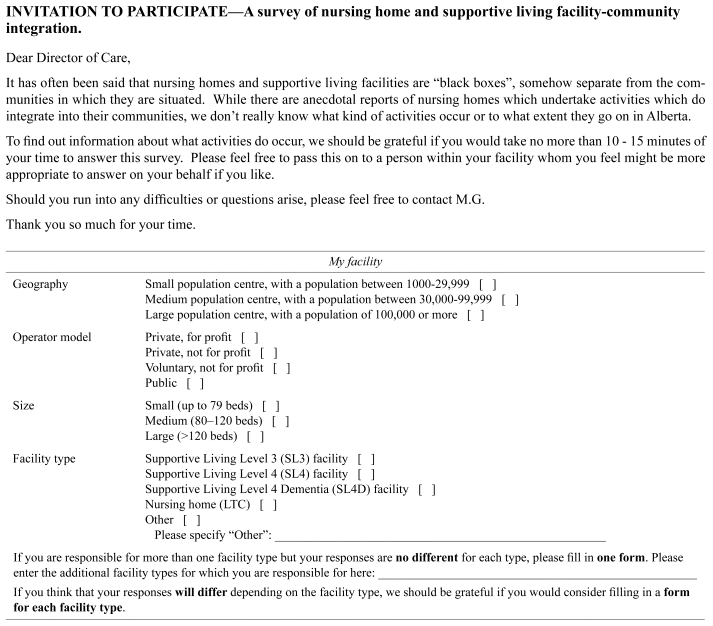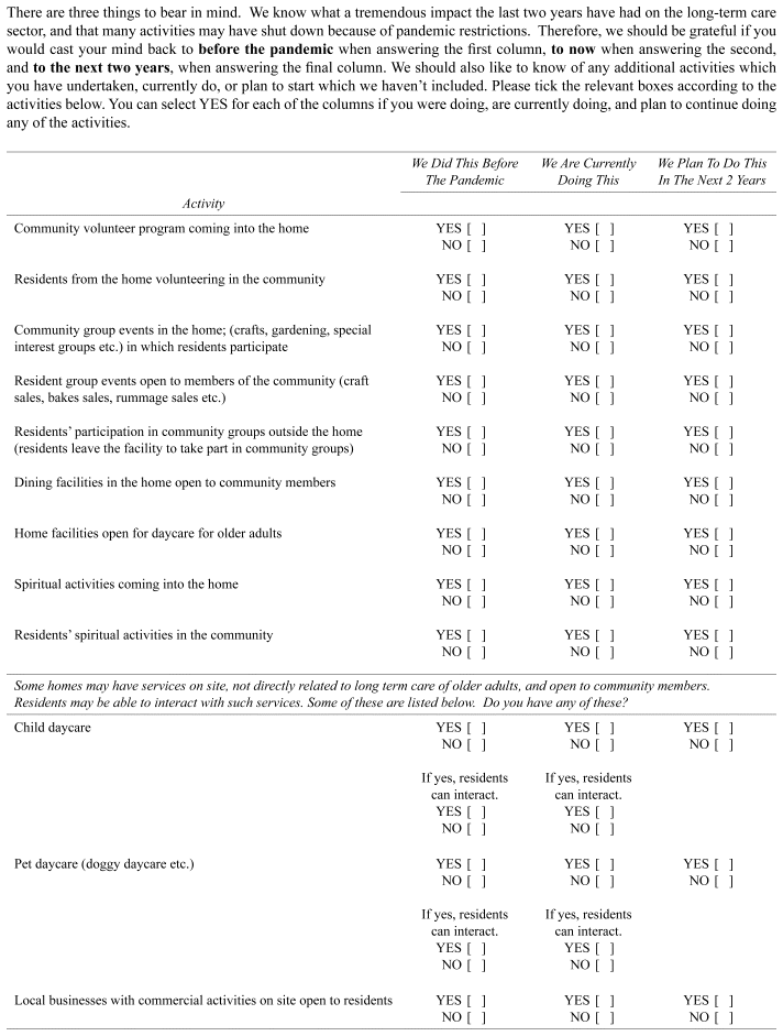 A cross-sectional survey (Appendix A) was emailed to all Albertan directors of care by M.G. Directors of care were free to delegate completion of the surveys as they wished. Each email contained a secure link to REDCap ( https://project-redcap.org), a data management system at the University of Alberta that housed all survey data.(26,27) Email addresses were acquired by telephoning facilities or through publicly available information.(25) The survey was open for responses from June to September 2022 and distributed to 334 homes. Demographic information was collected (Table 1). Respondents were asked about community-integrating activities that occurred in their home prior to the Covid-19 pandemic restrictions, at the time of the survey (2022), and any planned over the next two years.