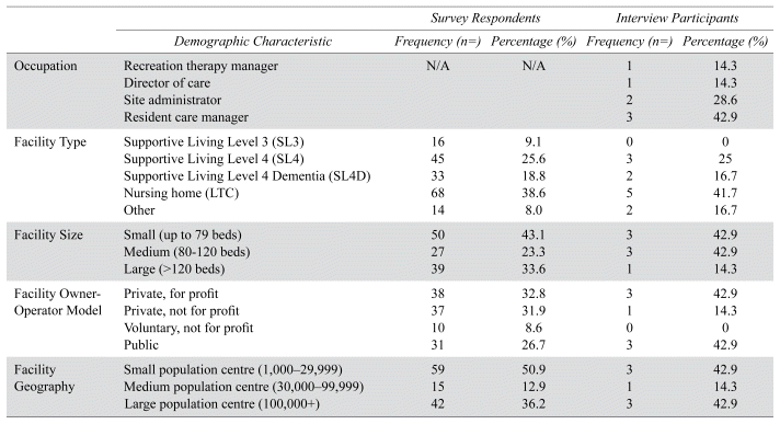 Of 203 SL facilities, 17 did not respond and five declined to participate; of 169 LTC homes, 14 did not respond and two declined. The survey was distributed to 181 SL facilities and 153 nursing homes, and 140 responses were received. Twenty were incomplete and removed; four responses were excluded as the site was not SL3, SL4, SL4D, nor LTC. The remaining 116 records were analyzed, for a response rate of 34.7%. The demographic characteristics were diverse (Table 1).