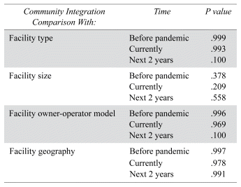 All responses were anonymized upon completion. Frequencies and percentages of yes/no responses were assessed for each question. Comparative analyses were conducted with chi-squared testing to determine any relationships between the extent of community-integrated activities and facility type, size, owner-operator model, and geography at any of the survey time categories.