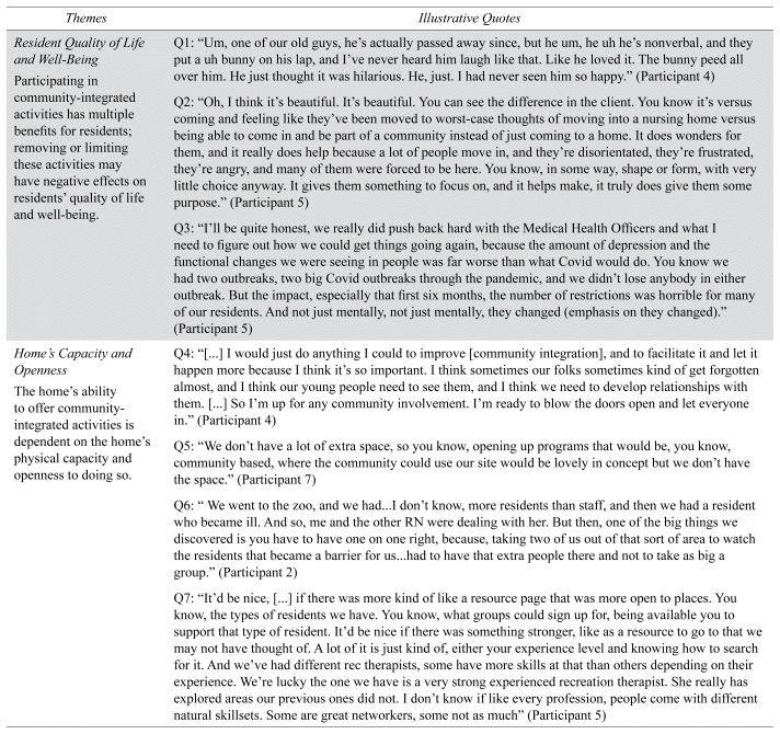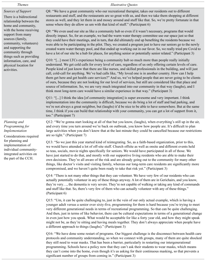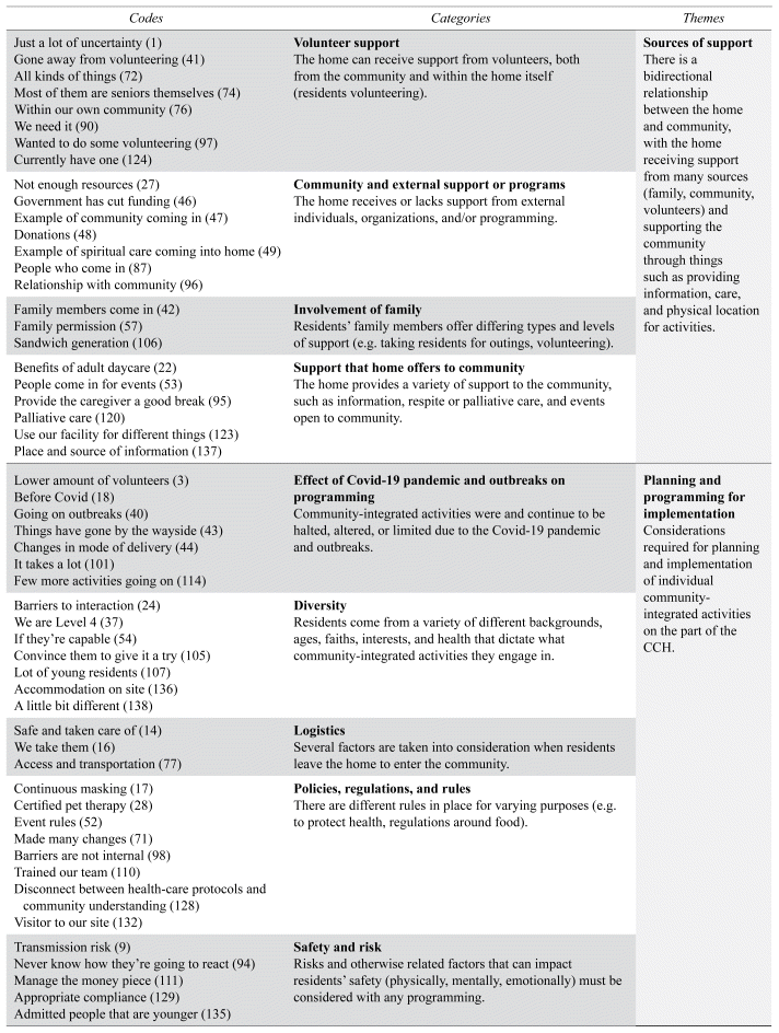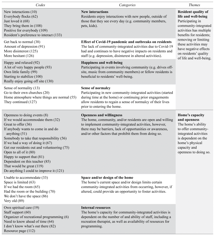 Analysis resulted in 99 codes, collapsed into 16 categories, and from which four themes emerged: 1) Resident quality of life and well-being; 2) Home’s capacity and openness; 3) Sources of support; and 4) Planning and programming for implementation (Appendix B).