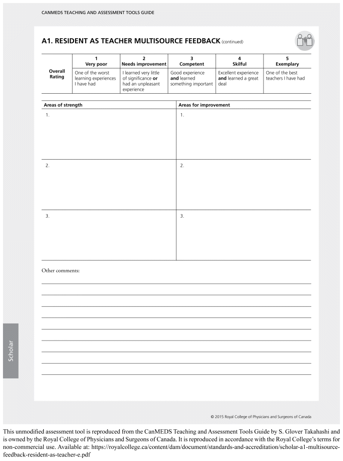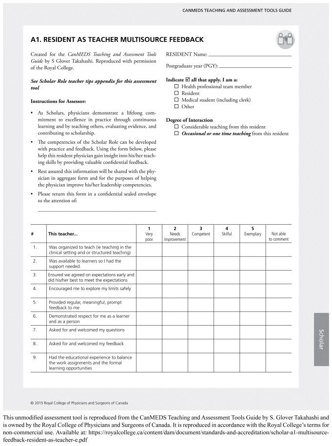 This unmodified assessment tool is reproduced from the CanMEDS Teaching and Assessment Tools Guide by S. Glover Takahashi and is owned by the Royal College of Physicians and Surgeons of Canada. It is reproduced in accordance with the Royal College’s terms for non-commercial use. Available at: https://royalcollege.ca/content/dam/document/standards-and-accreditation/scholar-a1-multisource-feedback-resident-as-teacher-e.pdf | ||