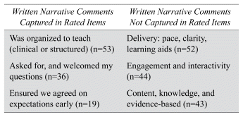 Item ratings allow raters to provide feedback that is organized and constructive.(8) Based on the narrative comments analyzed, domains that should receive focus on the rated items are: organization to teach, openness to questions, establishing expectations, delivery style, audience interactivity, and content knowledge.