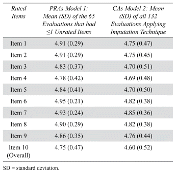 TABLE 2 Mean performance of geriatric medicine residents in each rated item is similar in both Partially Rated Assessments (PRAs) Model 1 and Completed Assessments (CAs) Model 2