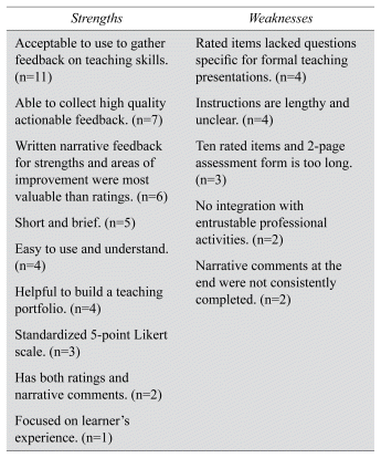 Eleven of 13 resident teachers who responded to the email survey found the RaTMSF acceptable as a tool to gather high-quality actionable feedback on their teaching skills. Resident teachers valued written narrative comments more than rated items, appreciated its brevity and ease of use, and commented positively on how it can contribute to building a teaching portfolio. Weaknesses of the RaTMSF were a lack of rated items specific to structured teaching, confusing instructions for the learner, and its length at two pages. Lastly, there was no formal integration of the RaTMSF with the residency program’s entrustable professional activity platform and, therefore, some resident teachers felt the RaTMSF was inconsequential (see Table 3 for thematic content of survey results).