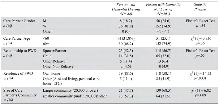 A total of 251 completed surveys were received, including 44 from CPs of current drivers with dementia, and 207 CPs of former drivers with dementia. Most CPs of current and former drivers with dementia were women, aged 60 years or older, and just over half identified as the spouse of the PWD. More CPs of PWD who continued to drive lived in smaller communities (< 20,000 residents) than CPs of former drivers (52.3 vs. 31.5%, p=.01) (Table 1). An equal number of participants reported that the PWD had stopped driving one to three years ago (41.09%) and greater than three years ago (41.09%). Driving cessation had stopped for 16.83% of PWD less than a year ago, and 0.99% indicated they were unsure as to when the PWD stopped driving. Most PWD no longer driving (67.01%) stopped driving either because a physician told them to, they failed a road test, or were required to by the driving regulator.