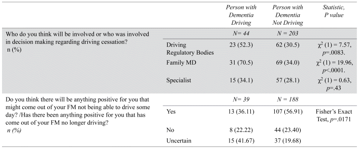 Analysis of the closed-ended questions revealed two key differences in survey groups regarding decision-making responsibility and positive outcomes from driving cessation (Table 2). CPs of current drivers with dementia largely expected family doctors (70.5%) to be involved in decision-making, followed by regulatory bodies (52.3%), and medical specialists (34.1%). The actual involvement of others in the driving cessation process was less frequent among CPs of former drivers than was anticipated by CPs of current drivers: family doctors (34.0% vs. 70.5%; p<.0001) and regulatory bodies (30.5% vs. 52.3%; p=.0083). When asked if anything postive had come from or was anticipated to come from driving cessation, CPs of former drivers were more likely to identify something positive (56.9%) than CPs of current drivers (36.1%, p=.0171). Analysis by gender did not reveal any significant effects.