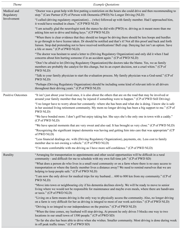CPs of current drivers with dementia provided few comments about medical and regulatory involvement in the driving cessation process, in contrast with CPs of former drivers, who emphasized their importance. Having a physician make the recommendation to stop driving and/or connect the PWD to the driving authority for a driving assessment was immensely helpful in addressing driving cessation. It meant averting “chaos” and lessening potential blame on the CP. Other CPs of former drivers reported that support from the medical/regulatory community was lacking, indicating, for example, that physicians were “hesitant” to contact the licensing organization, who were also deemed “unhelpful”. Overall, involving both physicians and the driving authority was frequently mentioned as a recommendation to ease the decision-making and transition to non-driving for CPs and drivers with dementia.