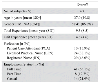 Sixty-three acute care staff provided informed consent to participate in the study (Table 1). The mean age was 36.9 years (SD = 10.8), and the majority were female (86.8%). Participants had an average of almost ten years of nursing experience, including nearly five in their respective units. The sample included RNs, LPNs and PCAs with most being employed full-time.