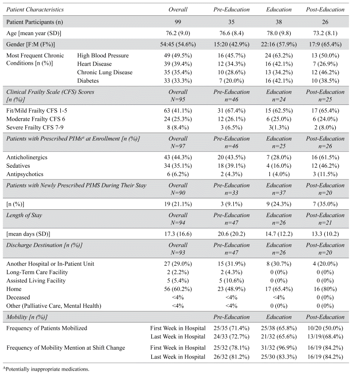 A mixed-method quasi-experimental design was used. The project occurred at five Horizon Health Network (Horizon) acute-care family medicine units in different cities/towns in New Brunswick, Canada. Patient participants underwent chart reviews and observational audits for mobility. Shift handover audits and questionnaires were used to gather data from front-line staff. Data collection was divided into three six-week phases: pre-education, education, and post-education.