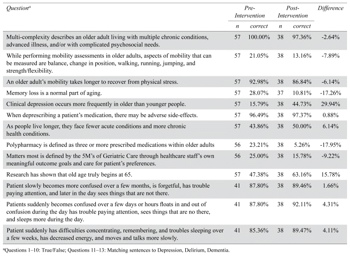 Participants completed the study-specific geriatric knowledge questionnaire pre- and post-education (Table 3). Before the training, most participants answered six items correctly (≥ 60%). Seven items posed challenges for the staff, including questions about each of the 5Ms. Following the training, six of these questions were still answered largely incorrectly, although three improved somewhat. Questions that were answered correctly pre-training displayed little change post-training.
