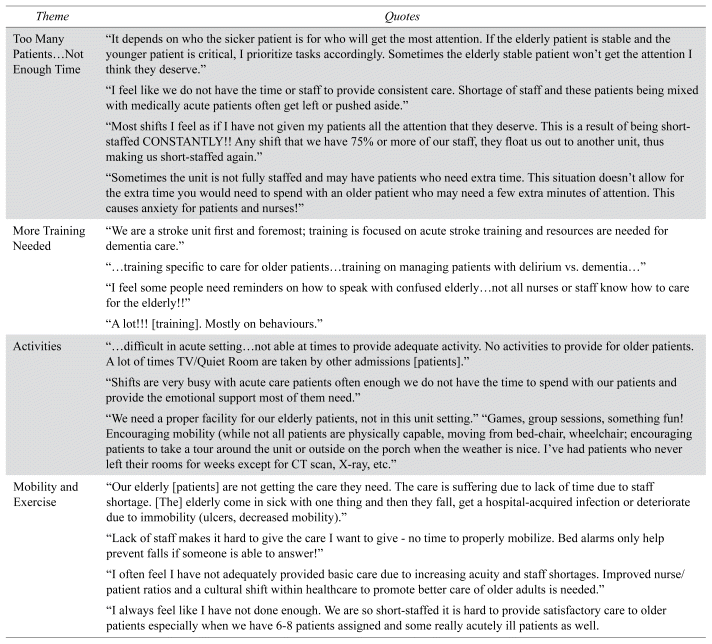 Some participants stated that, as their unit is not a geriatric unit, more training was needed in the general care of older adults. In contrast, several participants noted that more training was unnecessary, and that addressing staff shortages is required.