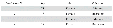 The demographic details of the participants in the primary data are outlined in Table 1. The average age of the caregivers was 76. All the caregivers who participated in the study were female and had university-level degrees.