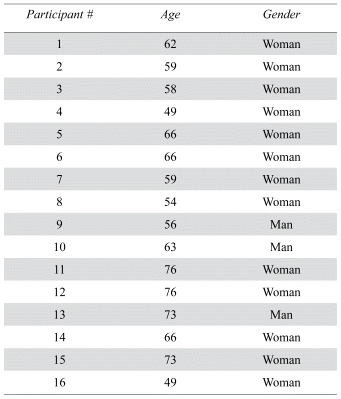 In the ‘Improving Care Study’, out of all the interviews, 16 participants from Quebec mentioned virtual consultations and the qualitative part of their responses were included in the secondary analysis. Table 3 outlines their age and gender.