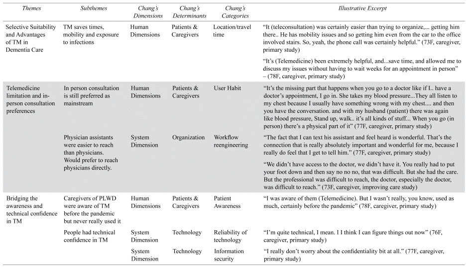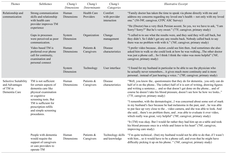 Data collection involved semi-structured interviews with caregivers recruited from a Montreal memory clinic and secondary analysis of two other studies related to dementia and telemedicine, focusing on the educational needs of patients and the impact of the pandemic on health-care services. Data analysis employed the framework method, combining inductive and deductive approaches to code the data and develop categories aligned with Chang’s framework, providing insights into caregivers’ experiences and the challenges and benefits of telemedicine.
