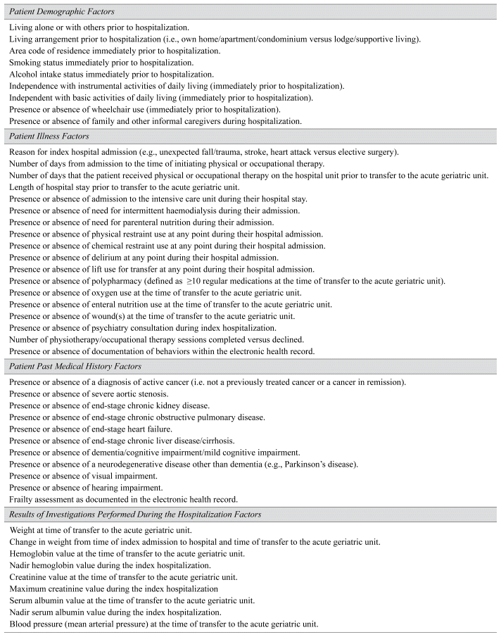 Twenty individuals participated in Round One of the prioritization procedure. Demographic information was not collected. The initial list of predictive factors included four categories: patient demographic factors (n= 9), patient illness factors (n= 18), patient medical history factors (n= 11), and results of investigations performed during the index hospitalization (n= 9) (see Table 1). A total of 19 additional factors were added to the original list based on participants’ suggestions, forming the Round Two survey. Additional factors were evaluated for appropriateness, repetition, feasibility, objectivity, and reliability of data collection.
