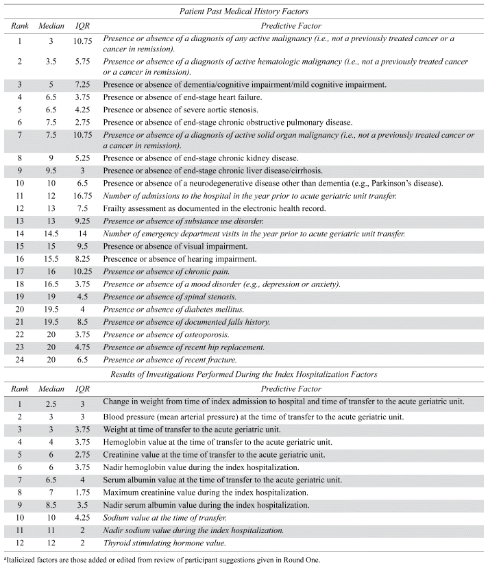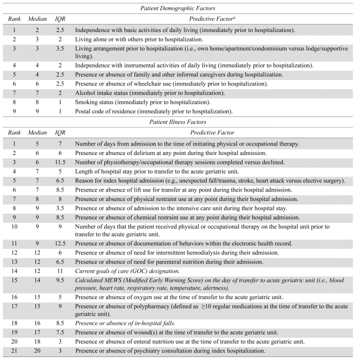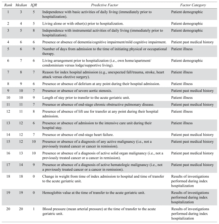 Round Two included 15 participants who ranked factors across each section including the factors added after round one. The top predictive factor from the patient demographic category was “Independence with basic activities of daily living (immediately prior to hospitalization)” (Median = 2, IQR = 2.5). The top predictive factor from the patient illness category was “Number of days from admission to the time of initiating physical or occupational therapy” (Median = 5, IQR = 7). The “Presence or absence of a diagnosis of any active malignancy (i.e., not a previously treated cancer or a cancer in remission)” (Median = 3, IQR = 10.75) was rated highest from the patient past medical history category. Finally, “Change in weight from time of index admission to hospital to time of transfer to the acute geriatric unit” (Median = 2.5, IQR = 3) ranked highest in the results of investigations performed during the index hospitalization category. See Table 2 for Round Two rankings.