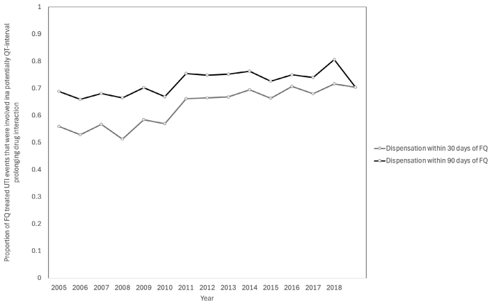 While our findings provide insight into potential pathways to pharmacovigilance in older women with bacteriuria, several limitations should be considered. The analysis is limited by a lack of clinical data on our patient population to further quantify risk of serious arrhythmia (e.g., underlying medical conditions, laboratory values, baseline QTc interval) and for having no assessment of patient outcomes related to the co-prescribing of medications with the potential for QT-interval prolongation. The eight most dispensed medications that can cause prolonged QT-interval were summarized annually, and presented only as aggregate results, which limits conclusions that can be made. Use of dispensation data allows only knowledge of medication dispensation and does not permit confirmation that patients were still receiving the potentially interacting drugs dispensed within 30 or 90 days of the FQ dispensation.