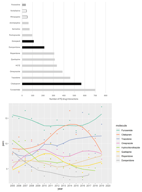 Drug interactions between FQ antibiotics and other medications that can prolong the QT-interval were described and reported as the proportions of FQ dispensations. Descriptive statistics included details of the proportion of patients concomitantly receiving a drug with “conditional”, “possible”, or “known” risk of QT-interval prolongation within 30 days of FQ dispensation. Descriptive statistics were repeated for the proportion of patients concomitantly receiving a drug with “conditional”, “possible”, or “known” risk of QT-interval prolongation within 90 days of FQ dispensation. A Mann-Kendall trend test assessed for increasing or decreasing FQ-drug interactions over the 15-year period of follow-up. Analysis was completed using SAS version 9.3 (SAS Institute Inc., Cary, NC) and some figures were prepared with R version 4.2.2 (R Foundation for Statistical Computing, https://www.r-project.org/foundation/) or Excel version 16.69.1 (Microsoft, Redmond, WA).