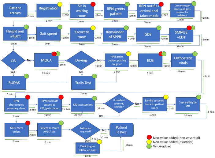 The next intervention was a new assessment guide to promote targeted cognitive testing and resource stewardship. Much of the variability in value added and non-value-added aspects of the assessment was due to the type of cognitive testing performed. Our patient advisor suggested that targeted testing may be more patient-centred, as testing can cause significant stress for the patient. Cognitive testing also had the greatest impact on the total amount of time required to complete the patient assessment. The assessment guide encouraged communication between RPNs and geriatricians to determine the most appropriate cognitive test. If the geriatrician was not available, the assessment guide included a flow sheet providing guidance on choosing the most appropriate test. From an equity perspective, the Snellgrove Maze task was added as an alternative to the Trail Making Test for patients who may not be familiar with the Roman alphabet due to limited English proficiency.