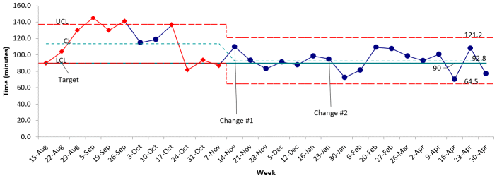 From August 2023, cycle time and associated outcomes of 53 new patient assessments were measured (two patients per week). The primary outcome of total cycle time decreased 19% from 114 minutes to 93 minutes with demonstration of sustainability over 17 weeks, reflected with the shift in the control limits (Figure 2). There was special cause variation noted within the baseline measurement period (Aug 15–Nov 7) that was due to the variable presence of resident learners in clinic (Aug 29–Oct 3). However, there was sustained decrease in average cycle time after the implementation of change initiatives despite ongoing variable resident presence (Nov 14, Nov 28, Jan 16–March 26, April 29–30)—reflective of usual clinical practice in an academic setting.