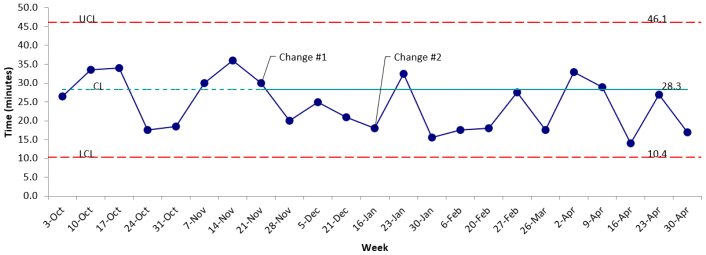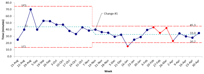FIGURE 2 Statistical process control (SPC) X-Bar R chart for new patient cycle time; red data points indicate special cause variation; special cause variation was noted consistently after change #1 so the centre line was shifted to demonstrate the sustained change