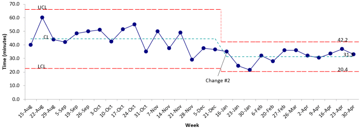FIGURE 3 Statistical process control (SPC) X-Bar R chart for caregiver interview time; caregiver interview time was the process measure for change #1, so only the time of initiation of change #1 is displayed; special cause variation was noted consistently after change #1 so the centre line was shifted to demonstrate the sustained change.
