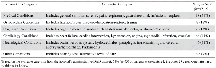 Of the 70 patients who were assigned to the patient navigator’s caseload, 61% were female and 39% were male, and the median age was 81, ranging from 55 to 96 years of age (IQR=11.8, Mean=80, SD=8.9). For the 45 patients (64%) who we were able to match to the hospital’s administrative system, the case-mix groupings were categorized into five main categories (see Table 1). The comorbid conditions in the same inpatient encounter were also captured where the majority of patients had various underlying comorbid conditions, including medical (e.g., respiratory, or neoplasm) (87%), musculoskeletal (e.g., fractures, or trauma) (51%), cognitive (e.g. delirium, or dementia) (49%), neurological (e.g., brain injury, or Parkinson’s) (22%), and mental health (e.g., depressive, or behavioural) (18%). Of the 45 persons, 60% (n=27) were designated as ALC.