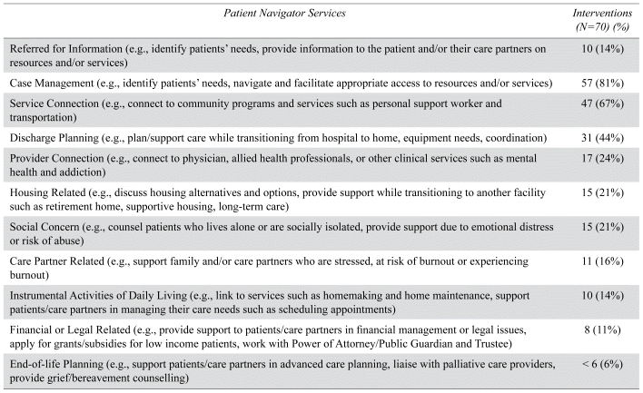 This retrospective observational cohort study provides an overview of a PNP that employed a community agency social worker who works alongside a hospital’s team. To the best of our knowledge, this PNP model of integrated care appears to be unique in terms of its structure; specifically with regard to having the patient navigator being embedded as part of the hospital’s team to address the patients’ concerns while in the hospital and provide follow-up support once discharged. While the PNP offered a number of similar services that other typical care providers offer (i.e., social workers, discharge planners, and case managers) in terms of case management and discharge planning, the added value of the patient navigator was their ability to identify and provide ongoing supports to patients and care partners throughout their care journey. For instance, the patient navigator provided guidance and support with instrumental activities of daily living (e.g., link to homemaking and home services, schedule follow-up care), financial/legal aid (e.g., apply for grants/subsidies for low income patients, work with Power of Attorney/Public Guardian/Trustee), and end-of-life plans. The patient navigator also provided social supports to patients experiencing social isolation and care partners experiencing burnout.